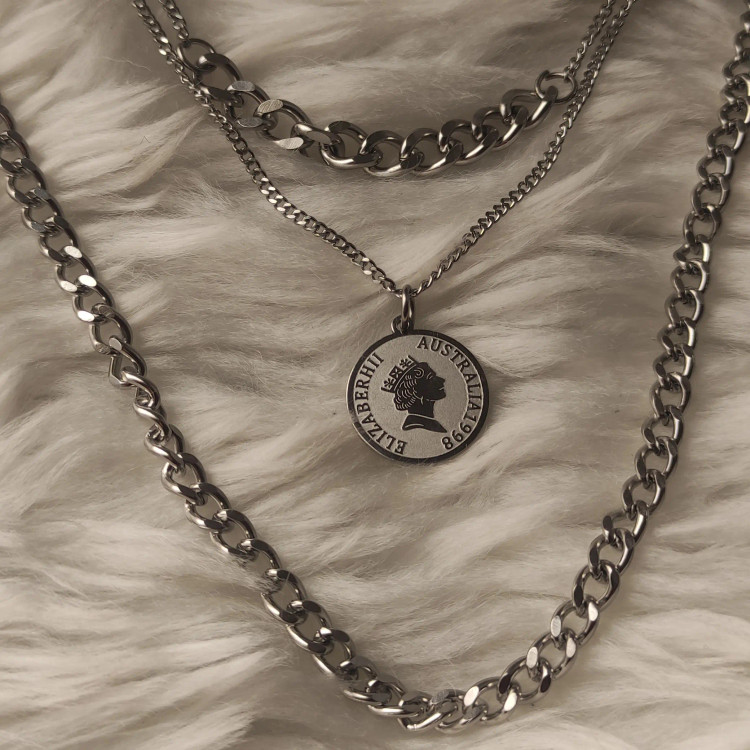 گردنبند سه لاین کارتیر و زنجیر دیپلمات استیل زیبا نقره ای با آویز سکه الیزابت بسیار خاص رنگ ثابت