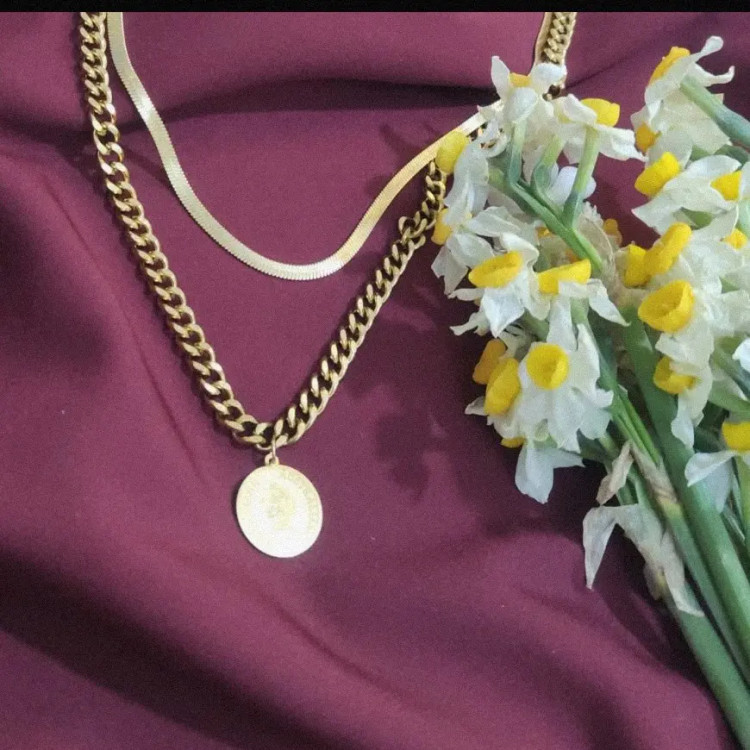 زنجیر دو لاین ماری و کارتیر با آویز سکه الیزابت بسیار جذاب رنگ ثابت مشابه طلا پر طرفدار