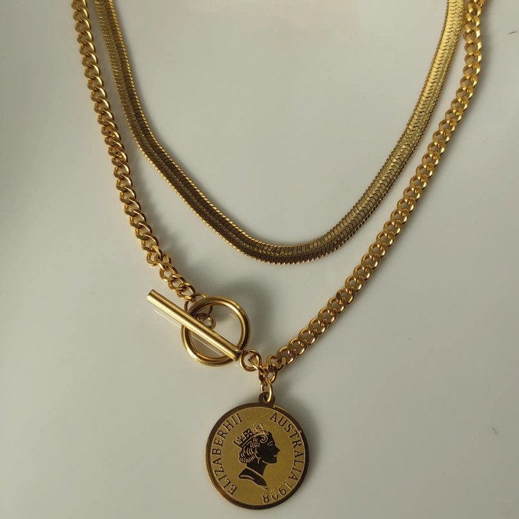 گردنبند دو لاین ماری و زنجیر کارتیر تراشخورده با قفل تی و آویز سکه الیزابت