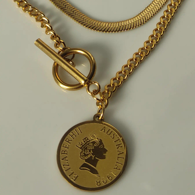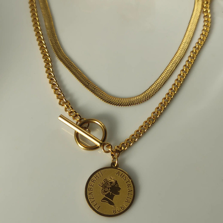 گردنبند زیبای دو لاین هم زنجیر ماری زیبا داری و هم کارتیر تراشخورده ظریف قفل تی و آویز سکه الیزابت زیبا استیل و رنگ ثابت